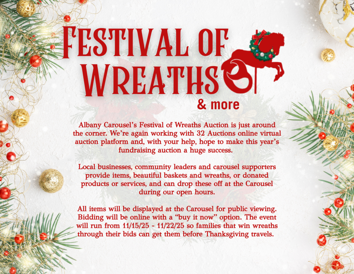 FESTIVAL OF WREATHS DONATION FORM – Albany Carousel’s Festival of Wreaths Auction is just around the corner. We’re again working with 32 Auctions online virtual auction platform and, with your help, hope to make this years fundraiser a huge success. Local businesses, community leaders, and carousel supporters provide items, beautiful baskets and wreaths, or donated products and services, and can drop these off at the Carousel during our open hours. All items will be available for public viewing. Bidding will be online with a “buy it now” option. The event will run from 11/15/25 – 11/22/25 so families that win wreaths through their bids can get them before Thanksgiving travels. We appreciate your support and look forward to providing a well attended opportunity to showcase your business, or simply your generosity and holiday spirit!